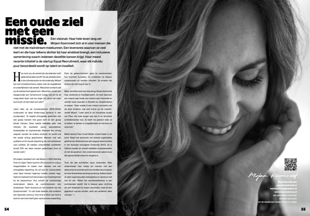 Haar persoonlijke betrokkenheid, onderstreept door de ontwikkeling van inclusieve projecten zoals stadstours door gidsen met een beperking. Bewustwording van inclusie begint al bij onze kinderen, daarom ontwikkelde Mirjam een kinderboek over diversiteit. Deze initiatieven tonen aan dat verandering begint bij bewustwording en educatie vanaf jonge leeftijd.
